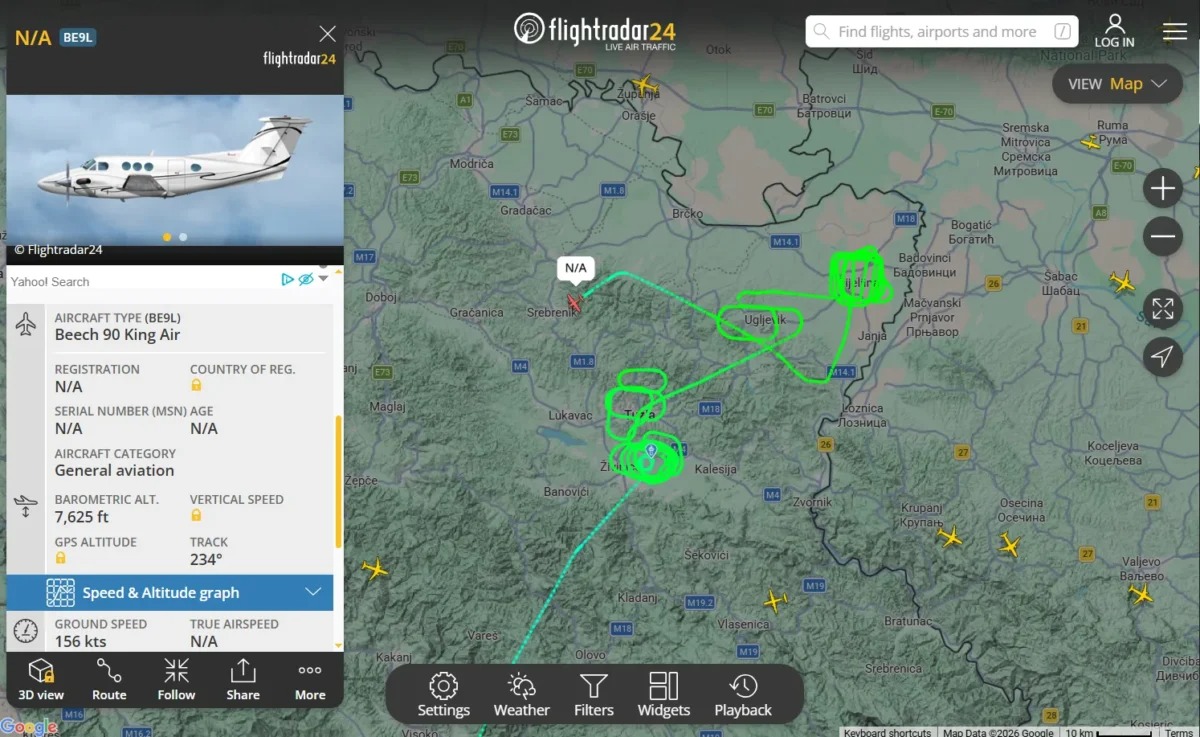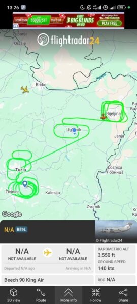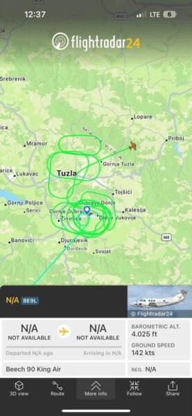 Danas je iznad Tuzle, Živinica i šireg područja sjeveroistočne Bosne i Hercegovine primijećen avion tipa Beechcraft King Air 90, registrovan u Velikoj Britaniji, pokazuju podaci sa platforme Flightradar24.