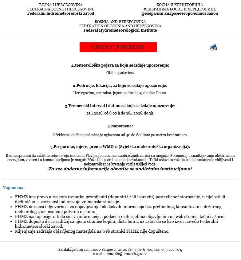 Meteorološke službe upozoravaju da će od ranih jutarnjih sati 25. februara obilne padavine zahvatiti Hercegovinu, kao i centralne, jugozapadne i jugoistočne dijelove Bosne i Hercegovine.