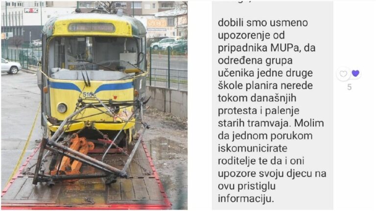 U više roditeljskih Viber grupa podijeljena je poruka upozorenja o mogućim neredima na današnjim protestima. Prema navodima iz poruke, jedan roditelj tvrdi da je usmeno upozoren od pripadnika MUP Kantona Sarajevo da određena grupa učenika planira izazivanje incidenata, uključujući i paljenje starih tramvaja.