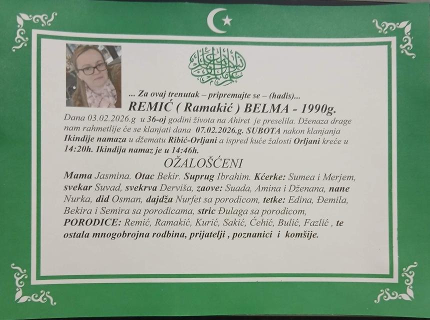 U Bihaću je u 36. godini života na Ahiret preselila Belma Remić (rođ. Ramakić), a dženaza-namaz klanjat će se u subotu, 7. februara 2026. godine, u džematu Ribić–Orljani.
