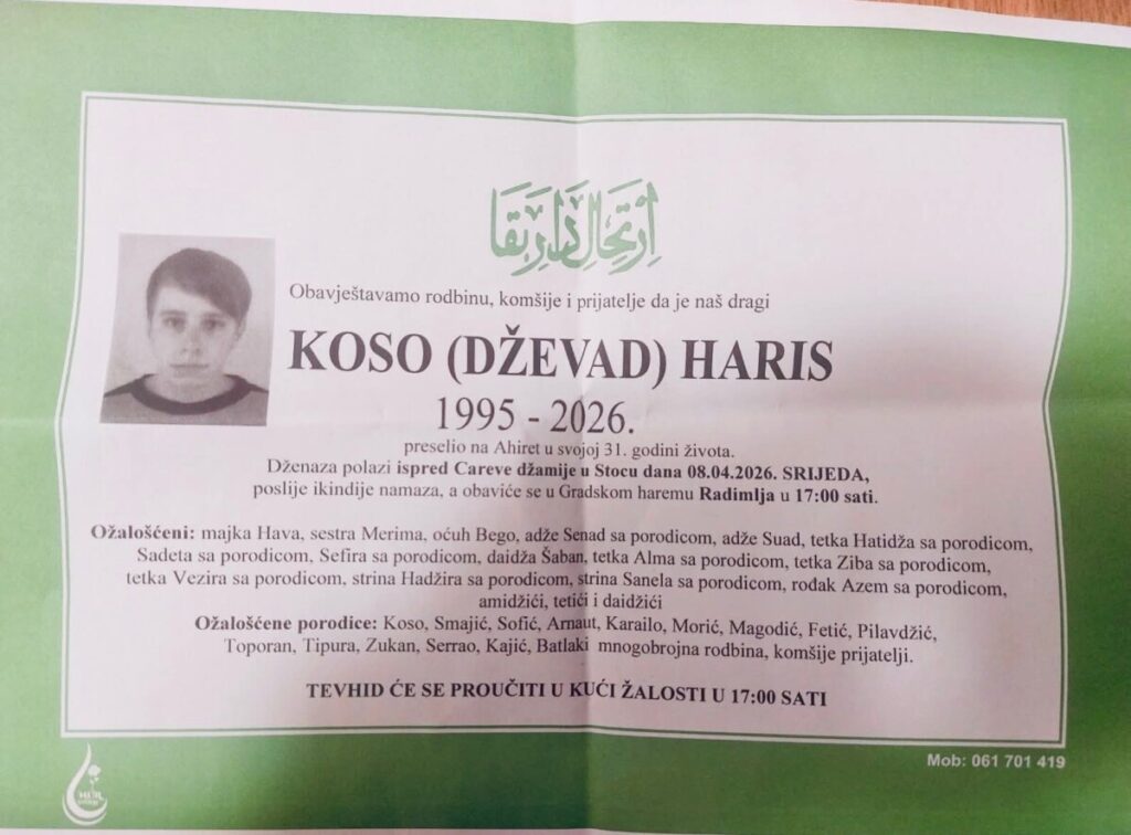 U Stocu je ugašen još jedan mladi život. Haris Koso, kojeg su sugrađani pamtili kao vedrog, nasmijanog i izuzetno plemenitog mladića, preselio je nakon duge i teške bolesti, ostavljajući duboku tugu među porodicom, prijateljima i komšijama.