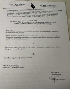 U dokumentu koji je podijelio vidi se da je 13. februara 2008. godine donesena odluka o imenovanju Željane Zovko za izvanrednu i opunomoćenu ambasadoricu Bosne i Hercegovine u Madridu, što je standardna diplomatska titula. Dokument je, kako se vidi, sastavljen na hrvatskom jeziku.