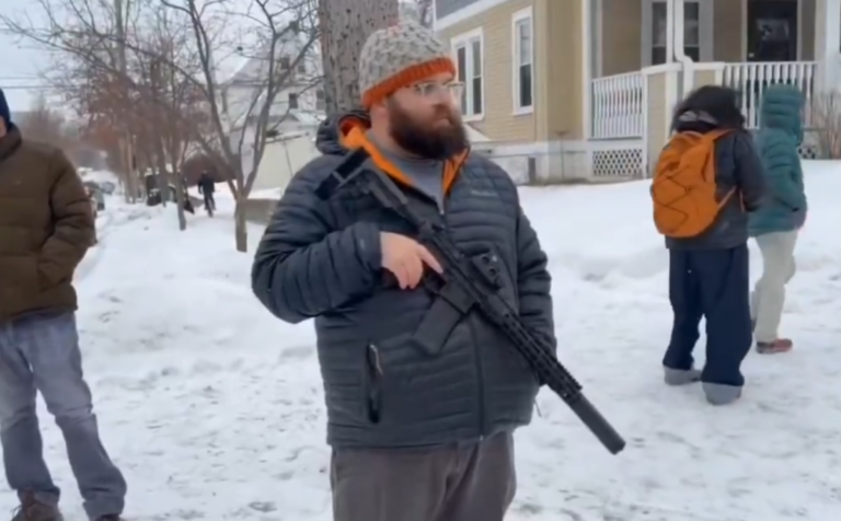 🚨 BREAKING: A man armed with a rifle is now standing guard outside a home in St. Paul after multiple ICE sightings in the area.