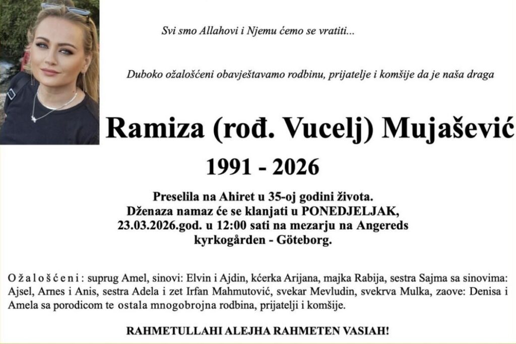 Dženaza-namaz Ramizi Mujašević klanjat će se u ponedjeljak, 23. marta 2026. godine u Göteborgu, gdje će biti i ukopana.