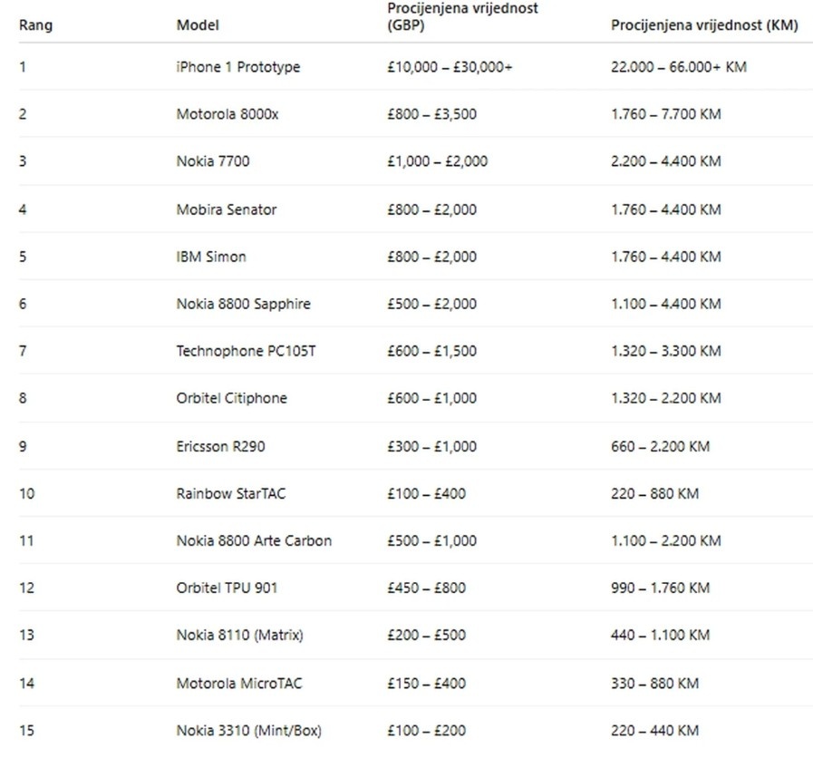Među traženijim uređajima nalaze se i Motorola 8000x, čija se cijena kreće od 1.760 do 7.700 KM, zatim Nokia 7700 s vrijednošću između 2.200 i 4.400 KM, kao i Mobira Senator koji može dostići slične iznose.