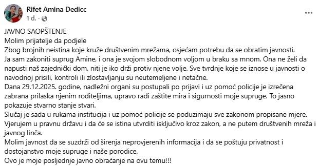 S druge strane, Rifat Dedić se oglasio na društvenim mrežama tvrdeći da je Amina u braku s njim svojevoljno.