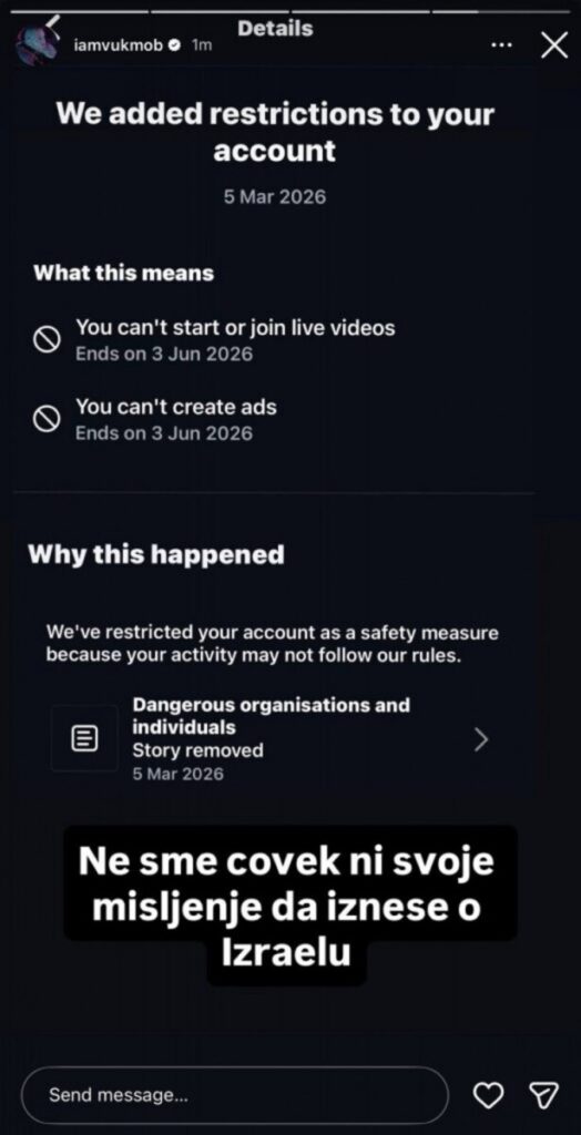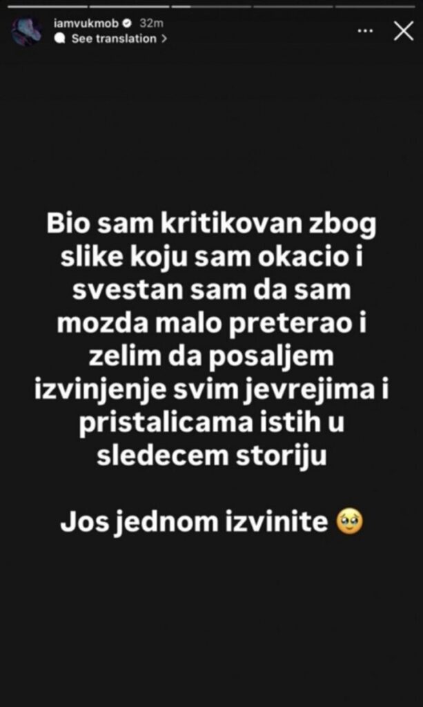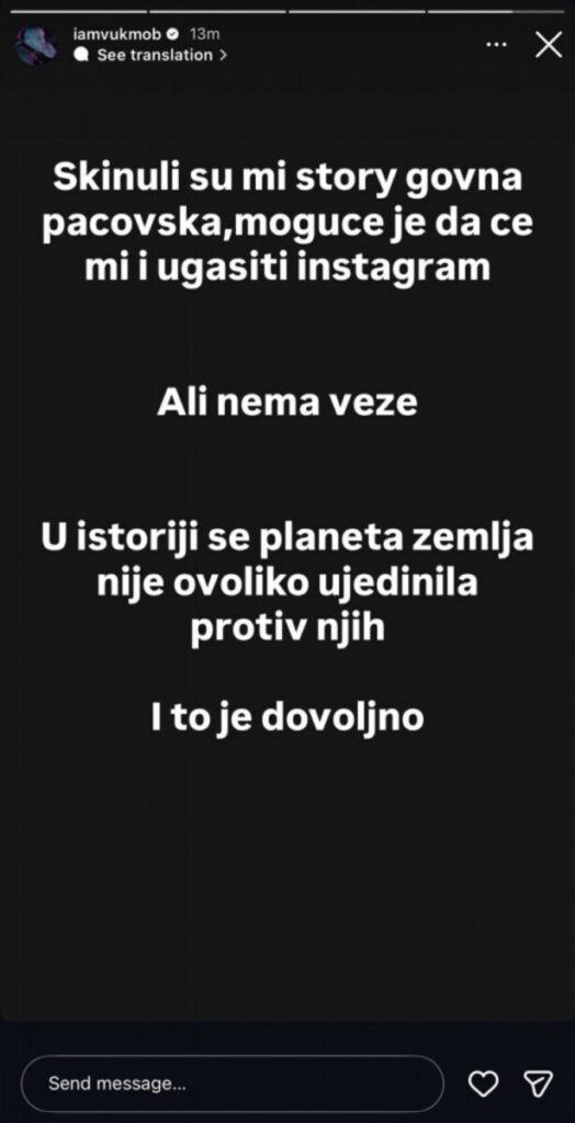 Instagram je ubrzo reagovao i uklonio sporni sadržaj sa njegovog profila. Vuk Mob je potom obavijestio svoje pratioce da postoji mogućnost da mu profil bude ugašen zbog objava koje je podijelio.