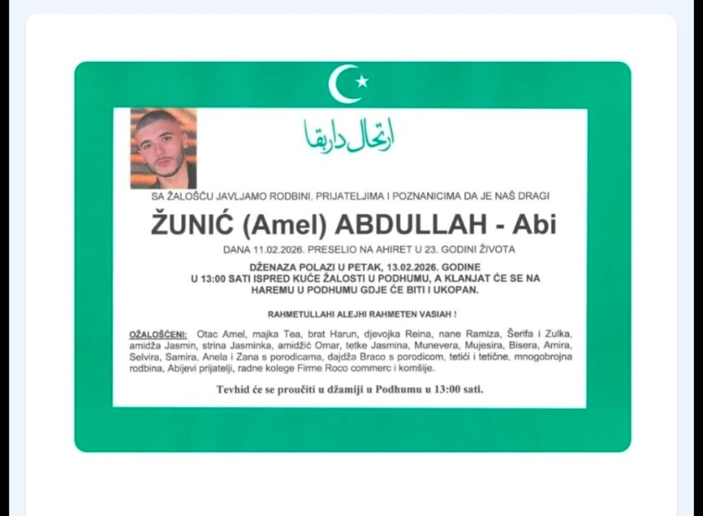 Prema podacima sa smrtovnice, Abdullah Žunić, poznat među prijateljima kao Abi, preselio je na Ahiret 11. februara 2026. godine u 23. godini života. Dženaza-namaz klanjat će se u petak, 13. februara 2026. godine u 13:00 sati u Podhumu, gdje će biti i ukopan. Tevhid će se proučiti u džamiji u Podhumu u 13:00 sati.