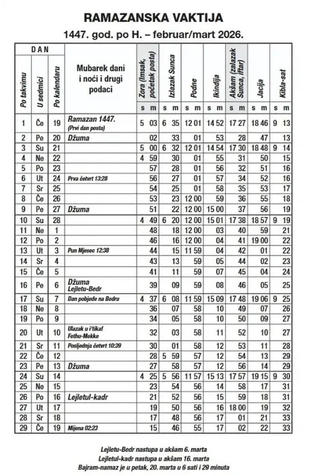 Ramazanska vaktija 1447. hidžretske godine (februar/mart 2026.)